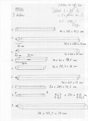 - Het feitelijke opstellingsplan: Het opstellingsplan is een stappenplan waar iedere balk die toegevoegd wordt een stap is. De filosofie achter de opstellingsplannen is dat er zo weinig mogelijk handelingen nodig mogen zijn om het sculptuur op te stellen