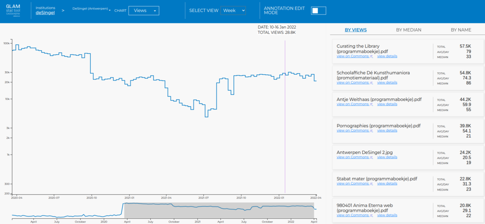 GLAMwiki Dashboard is een handige tool waarmee organisaties die materiaal op Wikimedia Commons plaatsten de impact daarvan kunnen opvolgen. Binnen de context van de Wikimedia-platformen behaalt de geüploade content van DE SINGEL wekelijks tussen de 4.700 en 93.200 views. Het meest bekeken bestand werd in totaal al 58.200 keer bekeken. De 10 vaakst bekeken digitale archiefstukken halen een mediaan van 20 views per dag en meer.