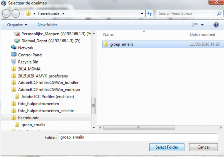 • Selecteer de map waar je de map met e-mails wil onderbrengen en klik ‘select folder’.
